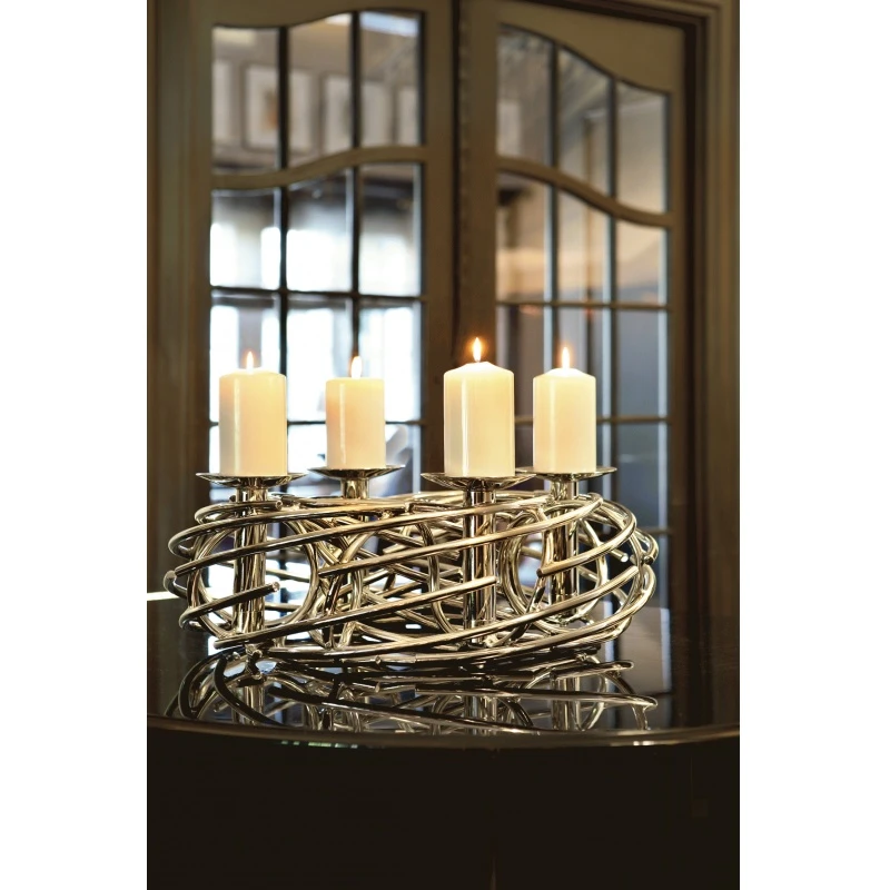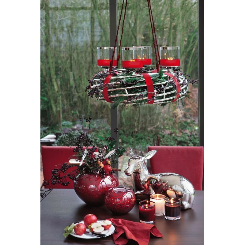 Fink CORONA 60 AdventskranzMaterial: vernickelt Mit dem Fink Corona Adventskranz präsentieren wir die moderne Interpretation des Adventskranzes und gleichzeitig einen stilvollen Ganzjahresartikel. Nehmen Sie einfach die Kerzenteller ab und setzen Sie die vernickelten Abdeckkappen auf. Ganz einfach wird der Fink Adventskranz so zum klassischen Dekokranz. Dekorieren Sie den Corona Adventskranz mit einer großen Glasvase in der Mitte oder zu Ostern als Osterkranz. Den Fink Corona Dekokranz gibt es in drei verschiedenen Größen. Der Corona Adventskranz mit Durchmesser 60cm ist optimal für eine edle Dekoration auf dem Esstisch, auf dem Sideboard oder auf der Anrichte geeignet. Der Fink Corona 60 ist mit dem passenden Nr. 168020 ein echtes Highlight und kommt im Eingangsbereich oder Wohnzimmer optimal zur Geltung. Genießen Sie den Fink Corona Adventskranz so wie er ist oder dekorieren Sie den Corona Kerzenkranz geschickt mit Tannenzweigen, Weihnachtskugeln oder Lichterketten. Lieferumfang: Corona Dekokranz, 4 Kerzenteller, 4 Abdeckkappen Geeignete Kerzengröße: Stumpenkerze mit dem Durchmesser 8 cm, Kerzenhöhe ca. 12 – 20 cm Für den Fink Corona 60 können Sie auch passend den Nr. 127075 als Glaszylinder mitbestellen. |