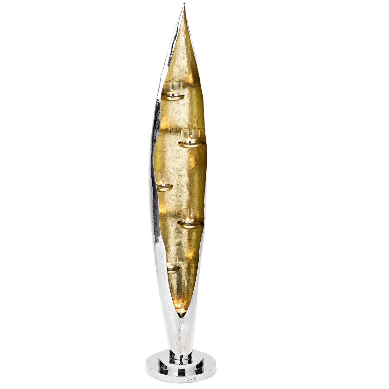 Fink Living CAVA Leuchter6- flammig, 6 Glaszylinder inkl. Maße: H 110cm, D 20cm Der Teelichthalter CAVA ist ein exklusives Deko-Objekt für Ihr Zuhause. Von einer natürlichen Blattform inspiriert und liebevoll handwerklich hergestellt ist der Leuchter ein echtes Highlight. Jeder Leuchter ist ein Unikat und trägt handwerkliche Merkmale. Die kunstvoll gehämmerte Oberfläche und die goldfarbene Innenseite sorgen für edle Lichteffekte. Sechs Glaszylinder für Teelichter sind enthalten. Die Glaszylinder sind lose und somit einfach zum Reinigen. |