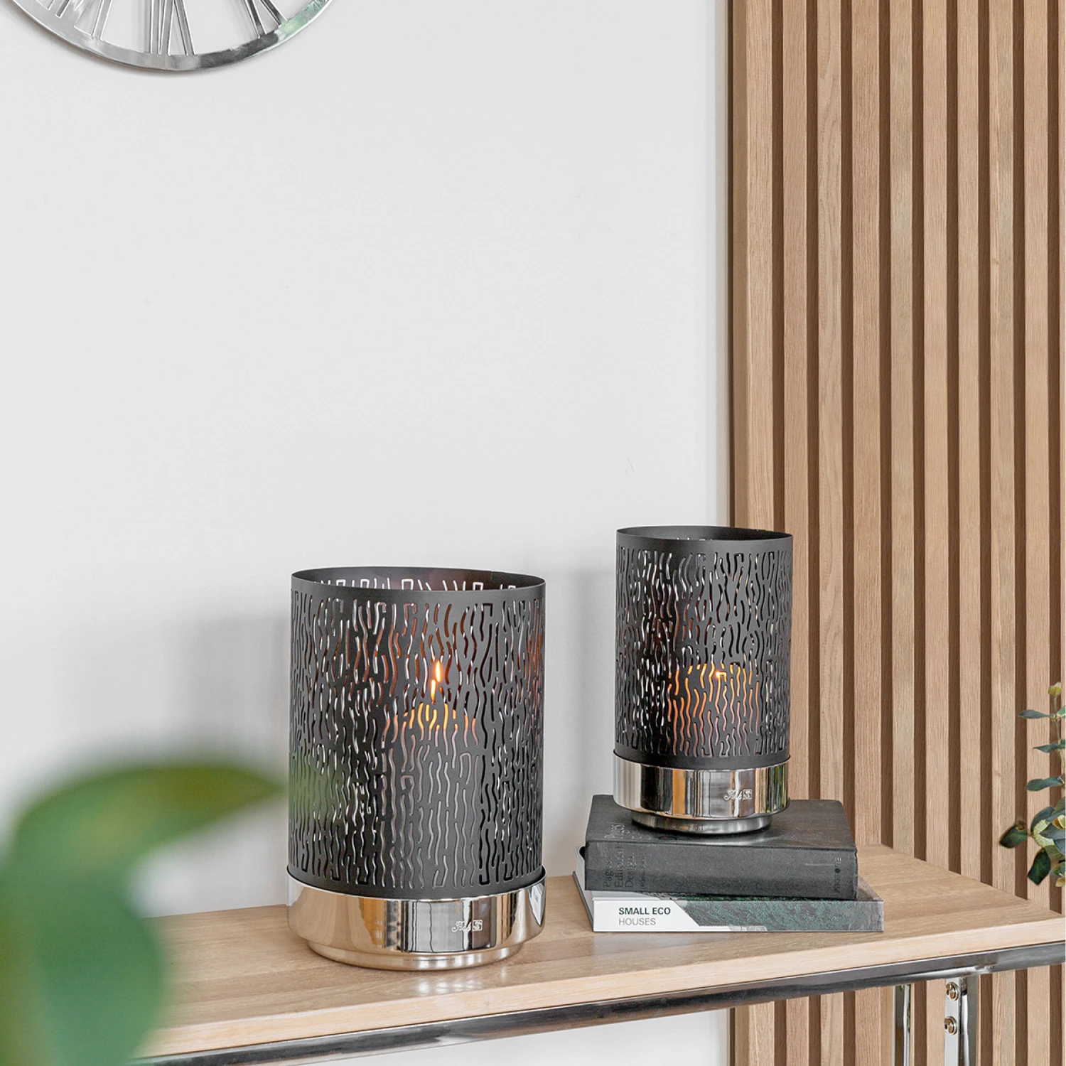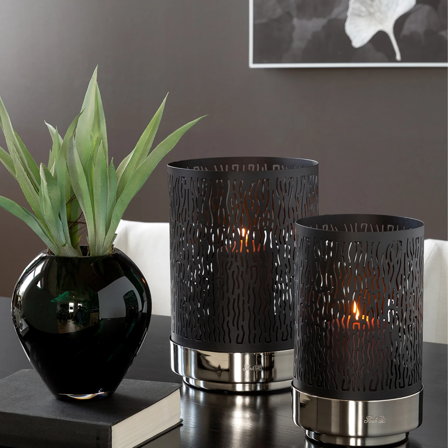 Fink Living Windlicht MARIAN Material: Eisen, pulverbeschichtet/ vernickelt Geeignet für eine Stumpenkerze D 8cm, H 10-15 cm MARIAN sorgt mit ihren wellenförmigen Cut-Outs für bezaubernd-sanfte Lichtstimmung nach Sonnenuntergang. Es stehen zwei Größen zur Auswahl, die in harmonischen Arrangements angenehm auffallen. Kleine Unregelmäßigkeiten in Form, Oberfläche oder anderen Details entstehen während der handwerklichen Produktion und verleihen jedem Artikel einen individuellen Charme. Jedes einzelne Exemplar ist ein Unikat. Windlicht wird ohne Kerze geliefert |