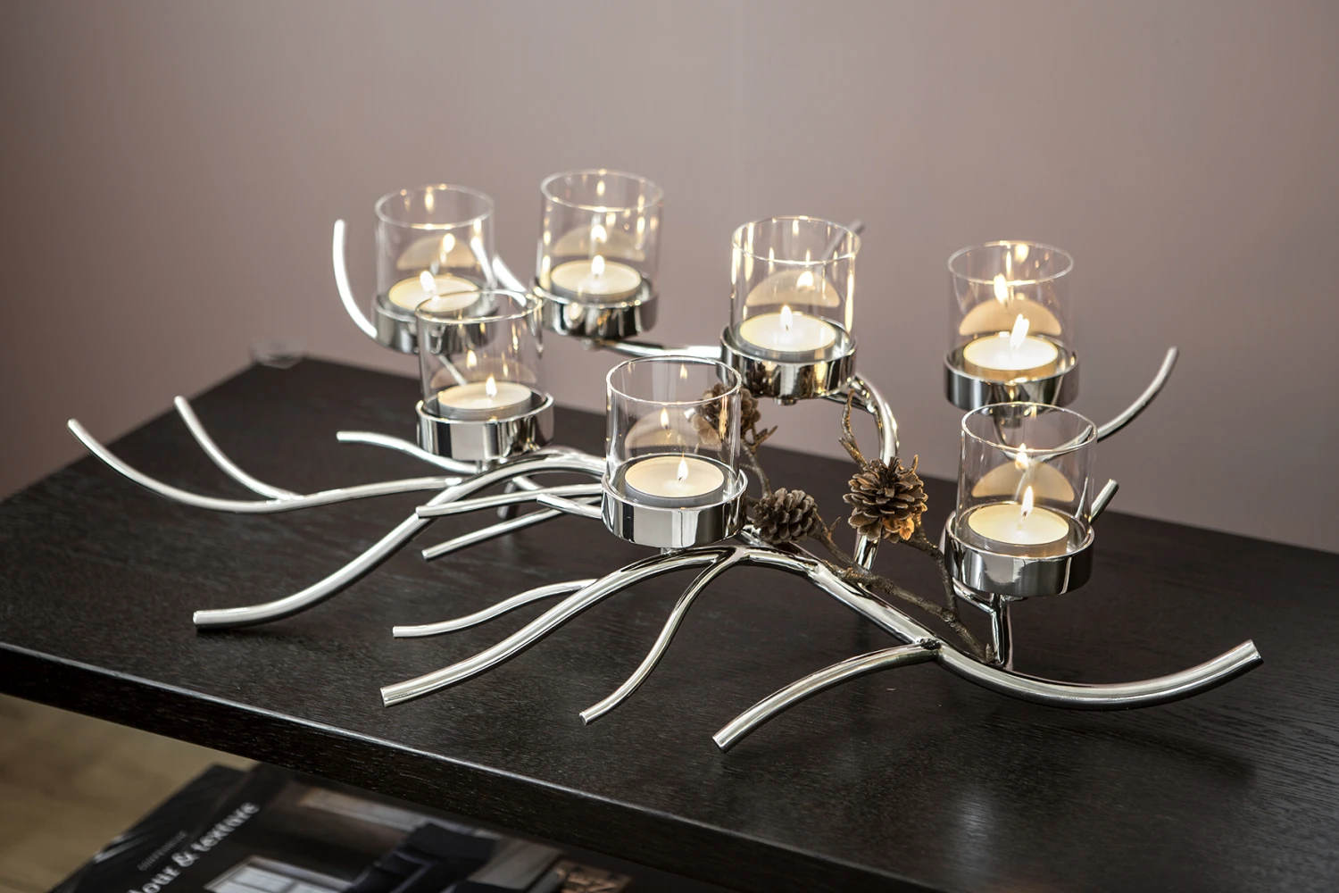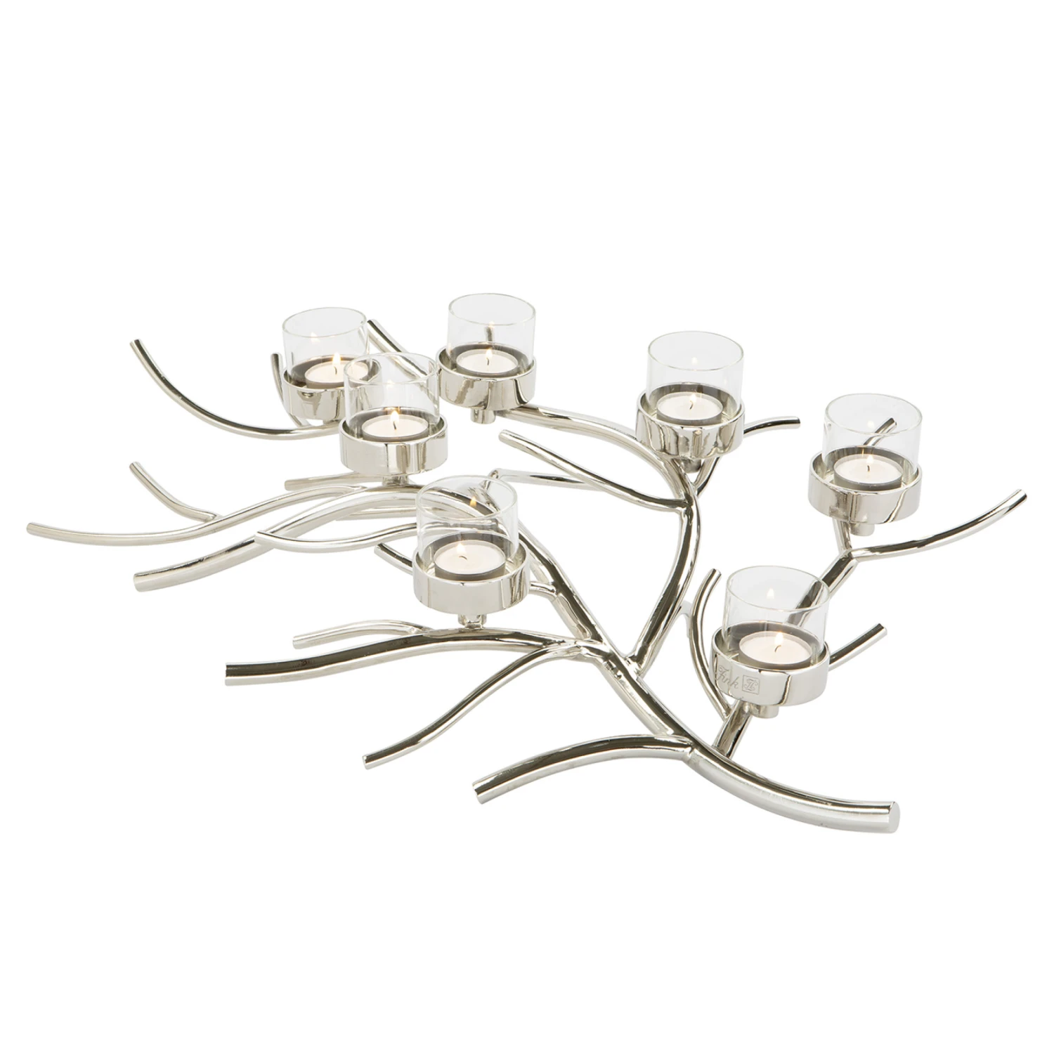 Fink Living Leuchter RAMUS7-flammig Material: Aluminium, vernickelt Glaszylinder ( 7 Stück) optional, Aufhängung ist im Lieferumfang enthalten. Der RAMUS Leuchter ist von einem Ast aus der Natur inspiriert: Filigrane Aststrukturen prägen die unverwechselbare Optik des vielseitigen Teelichthalters RAMUS. Der Leuchter ist ein echter Blickfang auf dem Sideboard oder Tisch, lässt sich aber auch leicht aufgehängt plazieren. Ob frei schwebend oder auch als Leuchter zu einem edlen Abendessen, RAMUS wird mit Sicherheit zu Ihrem neuen Lieblingsstück. Der Leuchter kann optional mit Glaszylindern erworben werden. |