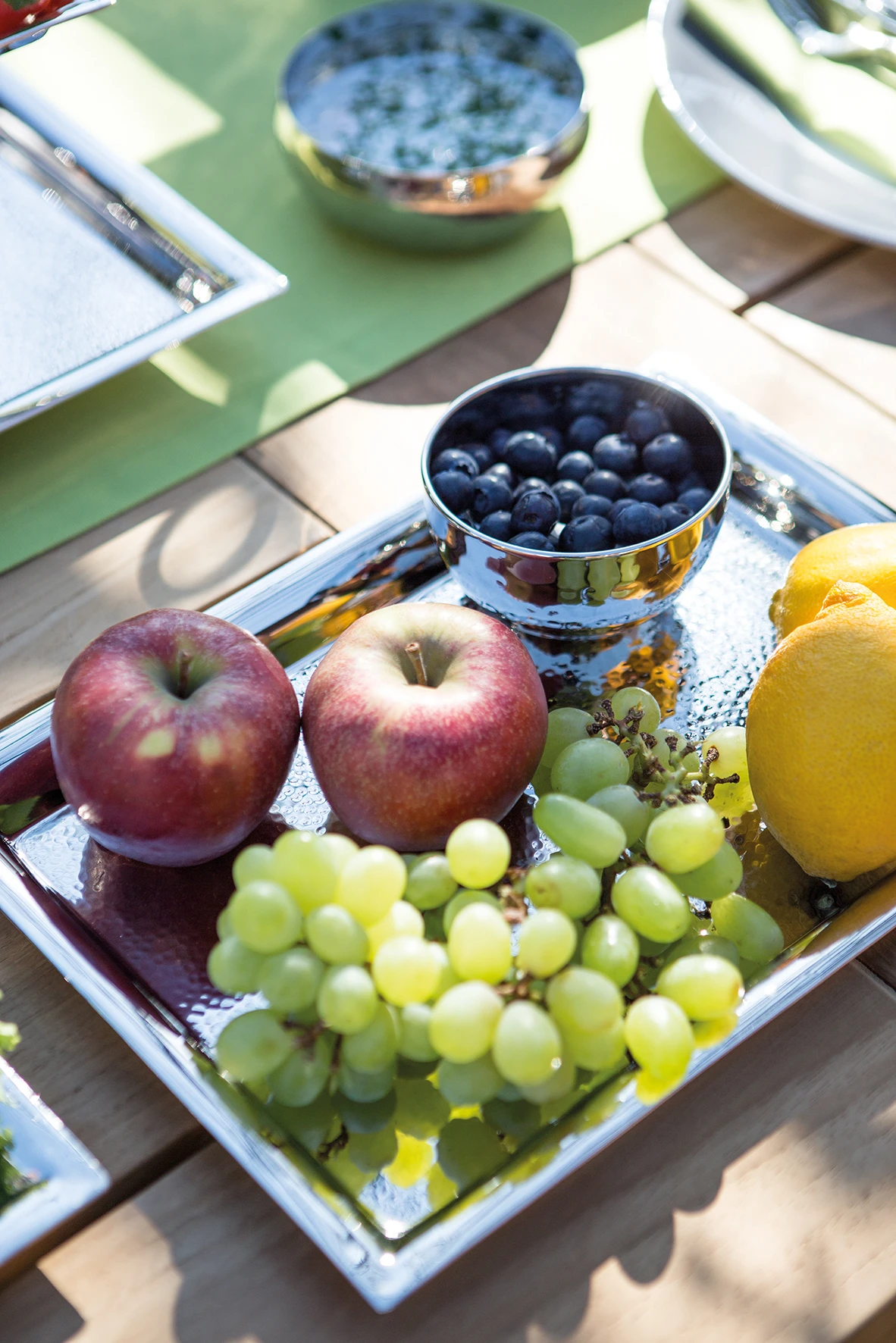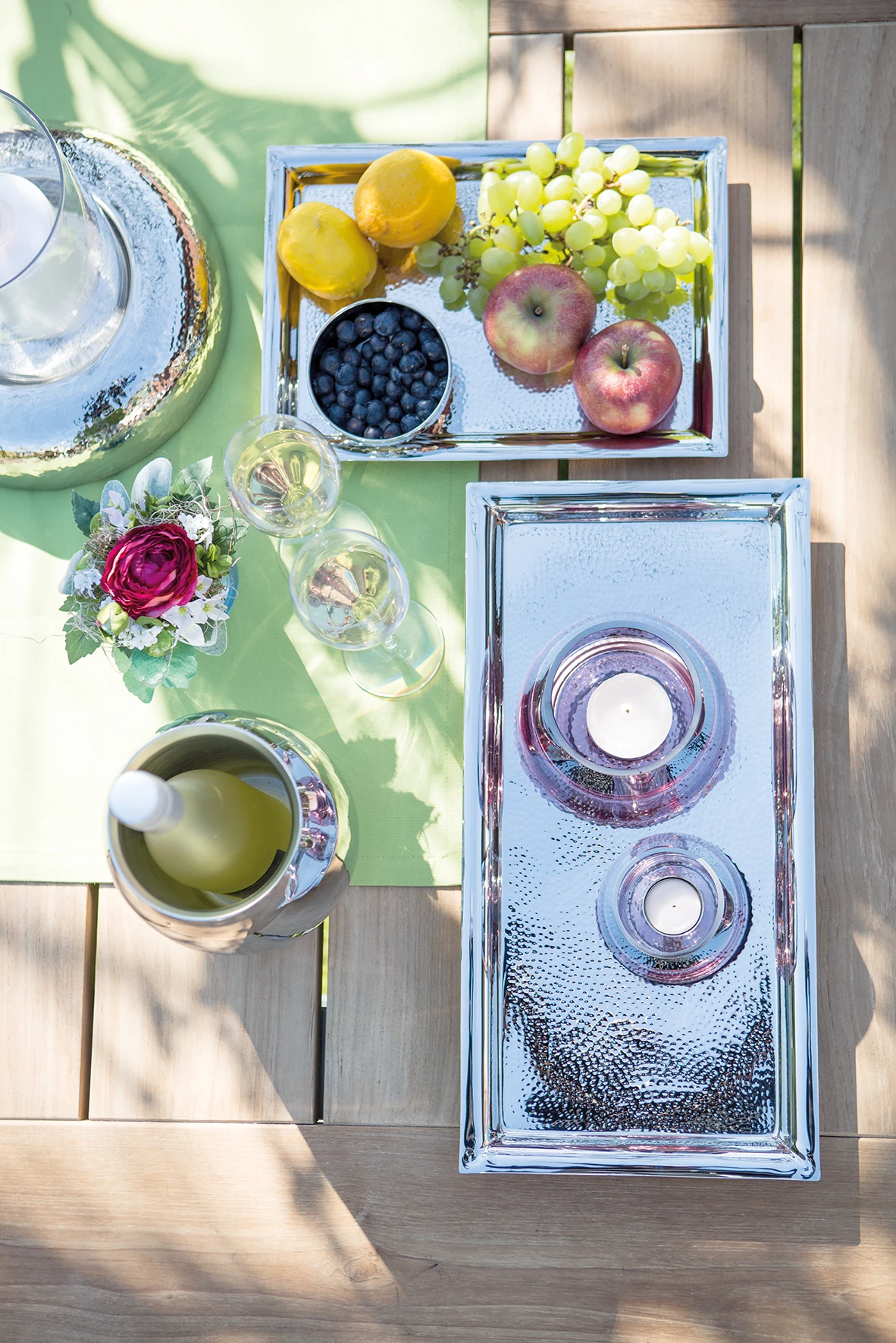 Fink Living Nagano Tablett Material: Edelstahl, gehämmert Das zeitlose Tablett Nagano eignet sich perfekt zum Servieren von Getränken oder kleinen Köstlichkeiten. Die Tabletts sind aus Edelstahl und somit sehr Pflegeleicht. Fink Produkte: – hochwertige Handarbeit |