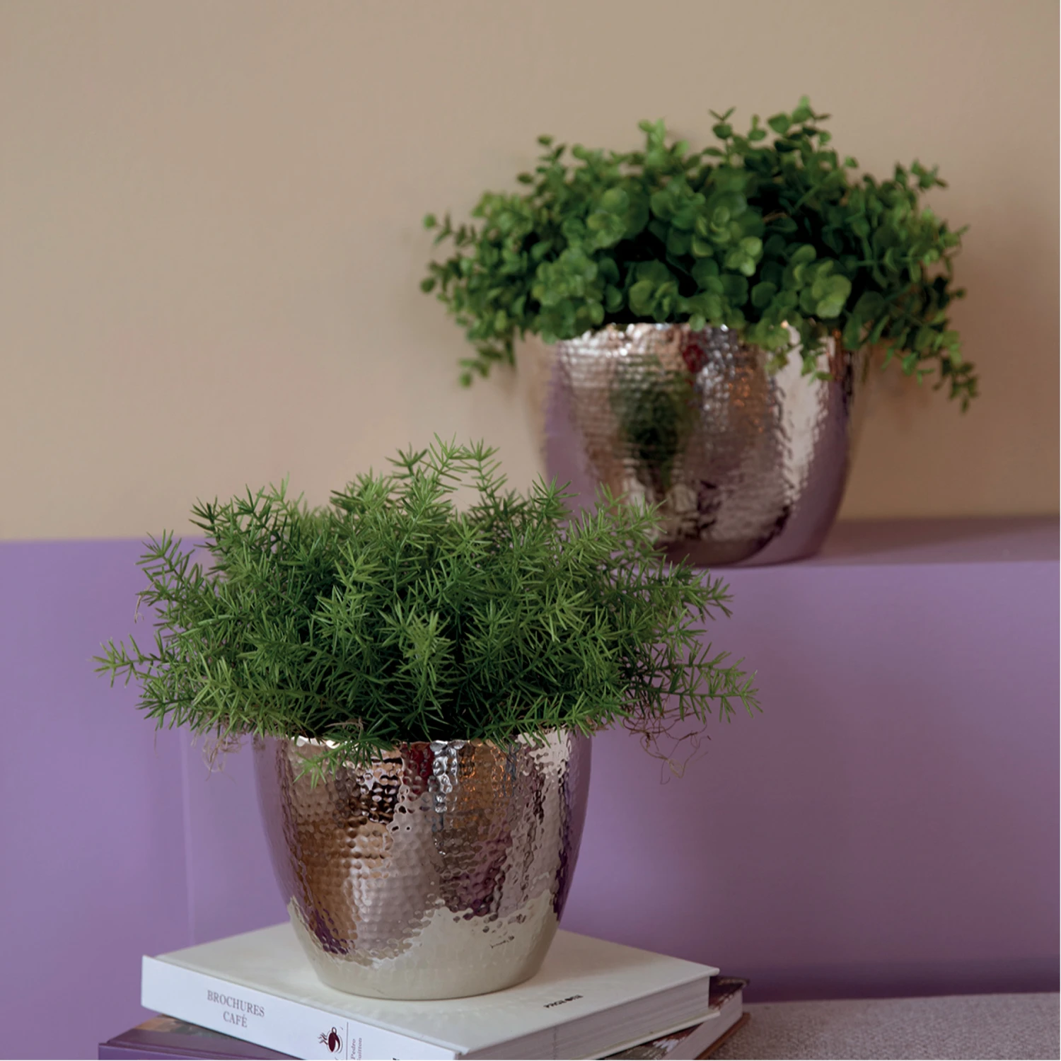 Fink Living SAKURA ÜbertopfMaterial: Eisen, vernickelt Das moderne Pflanzgefäß SAKURA gibt es in zwei Größen. Der Übertopf wird in aufwendiger, traditioneller Handarbeit gefertigt und besticht durch die kunstvoll gefertigte Hammerschlagstruktur auf der Oberfläche. SAKURA ist nicht Outdoor geeignet. Fink Produkte: – hochwertige Handarbeit |