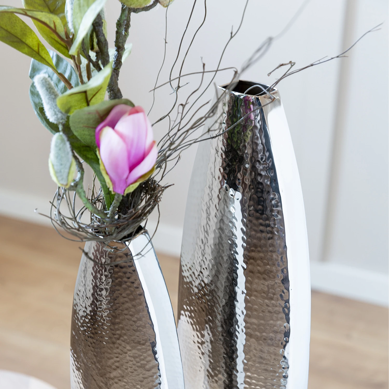 Fink Living Vase ALETTA Material: Edelstahl, gehämmert Die Vase ALETTA überzeugt durch ihre schlanke Silhouette und interessante Form. ALETTA kommt mit zarter, floraler Dekoration – wie einzelnen Rispen oder Zweigen – besonders zur Geltung. Dank dem Material Edelstahl ist die Vase auch Outdoor geeignet. Durch die aufwendige, traditionelle Handarbeit entstehen individuelle Unikate mit Charme. Fink Produkte: – hochwertige Handarbeit |