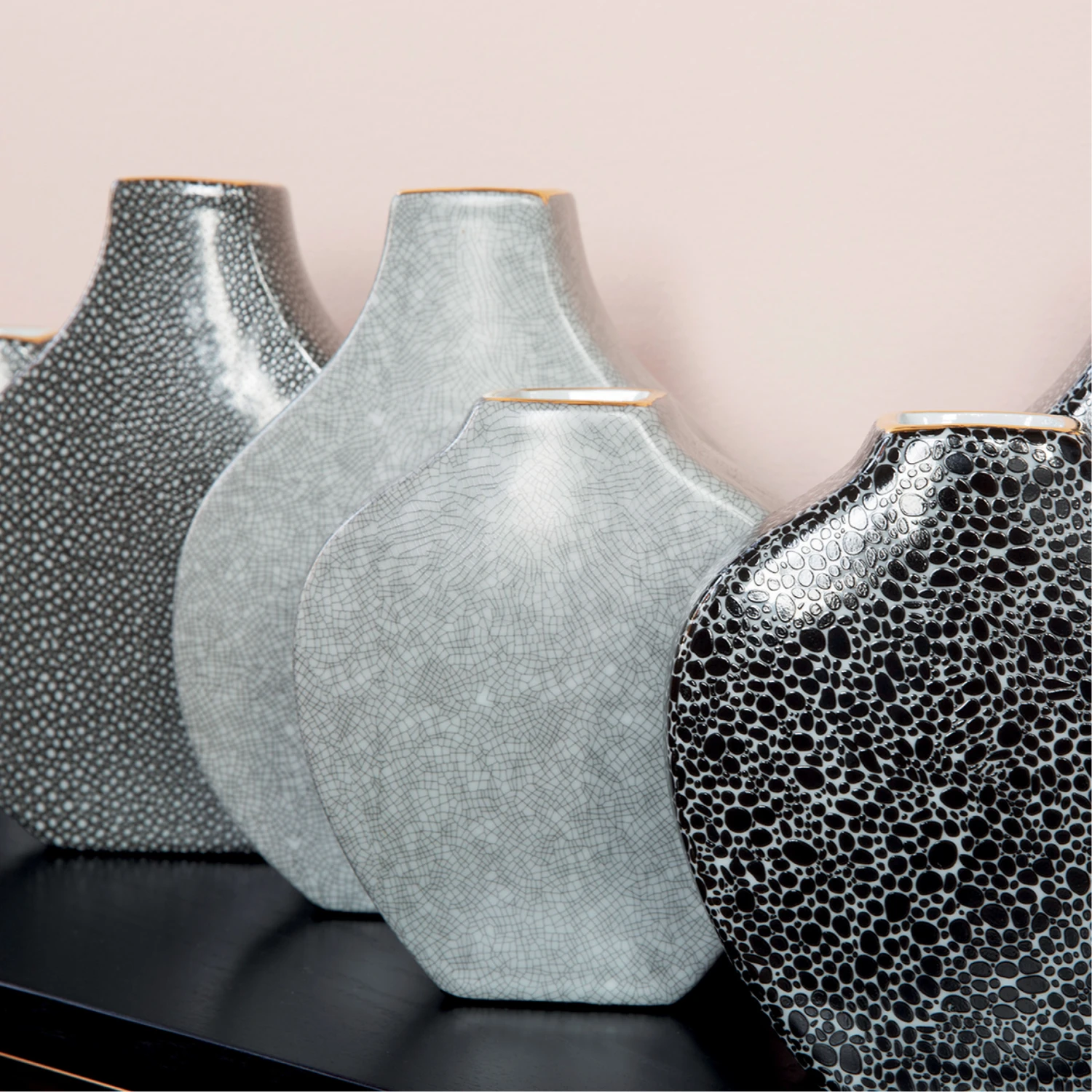 Fink Living Vase MINTA Material: Porzellan MINTA hat eine matt glänzende Oberfläche mit spannenden Details. Der edle Grauton und der handbemalte goldfarbene Rand geben der Vase einen Objektcharakter. Die Vasen werden in traditioneller Handarbeit hergestellt – jedes Stück ist ein Unikat. Optimal lässt sich die Vase mit langstieligen Blumen oder Zweigen bestücken. MINTA gibt es in zwei Größen. |