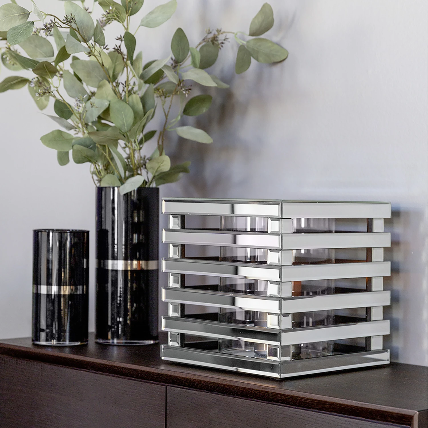 Fink Living Windlicht DILARA Maße: H 28cm, 28×28 cm inkl. Glaszylinder, ohne Kerze Das glamouröse Windlicht DILARA beeindruckt nicht nur mit geometrischen Design, sondern auch durch besonderen Chic und verspiegeltem Glanz. Der Kerzenschein spiegelt sich in den Flächen und Kanten und sorgt für ein schönes Licht. Mit großem handwerklichem Geschick wird jedes einzelne Glasobjekt in einem aufwendigen Herstellungsprozess in einer Glasmanufaktur gefertigt. |